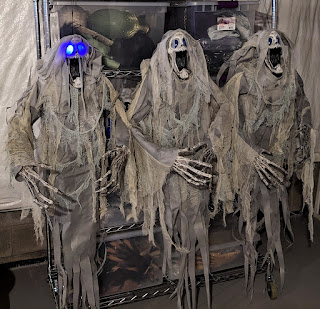 Halloween 2024 is going to be a "Haunted Mansion" theme. The 3 ghost props we ordered on sale from Halloween Express arrived today. Very happy that there is a volume dial on them that can be turned down to "no sound" so that just their blue light up eyes can be used. Not sure exactly where we're going to use them next year, but most likely they will be "Ghost on a Post" props along our walkway.